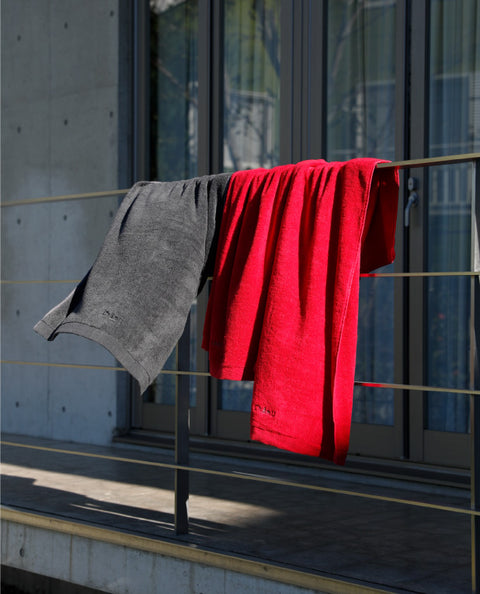 また、Wパイル構造にするために細い糸を 2 本使っており、隙間のある軽量の糸と、織り方による通気性の良さで、速乾スピードは通常の